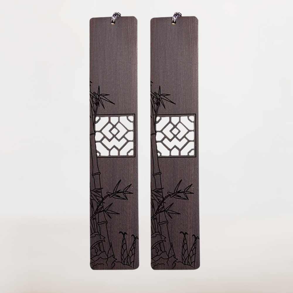 Marque page bois foncé gravé bambous avec découpe géométrique, signé Readlux, en 1 ou 2 pièces