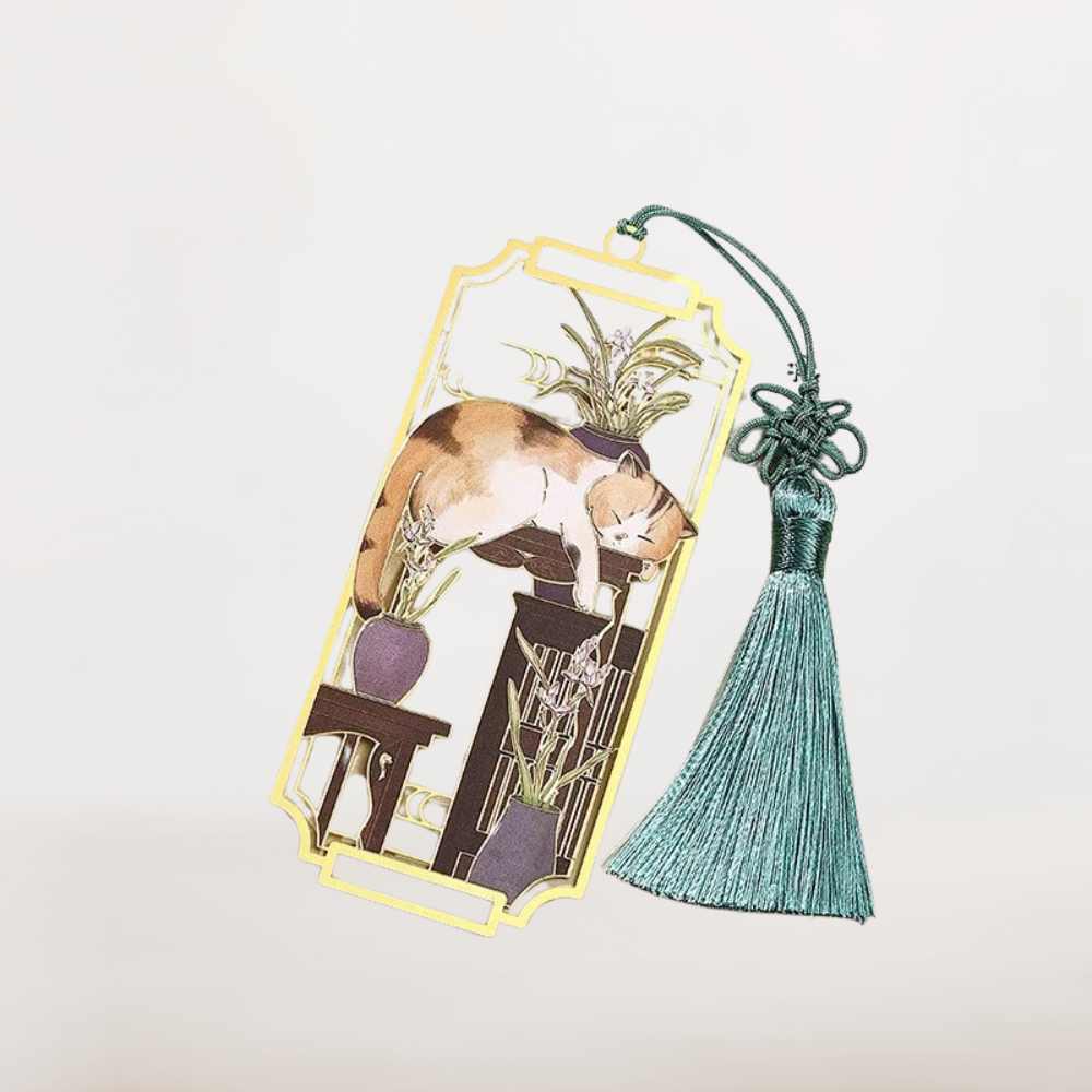 Dans un décor empreint de calme et d’harmonie, un chat somnole parmi les fleurs, figé dans une scène paisible. Ce marque page tout en finesse capture un instant suspendu, où la douceur féline s’invite dans vos lectures. Entouré de plantes délicates et de mobilier traditionnel, ce marque page chat rend hommage à l’art de la contemplation. Son design ajouré et sa silhouette dorée encadrent la scène comme un tableau miniature, transformant chaque pause en une échappée poétique et sensible.