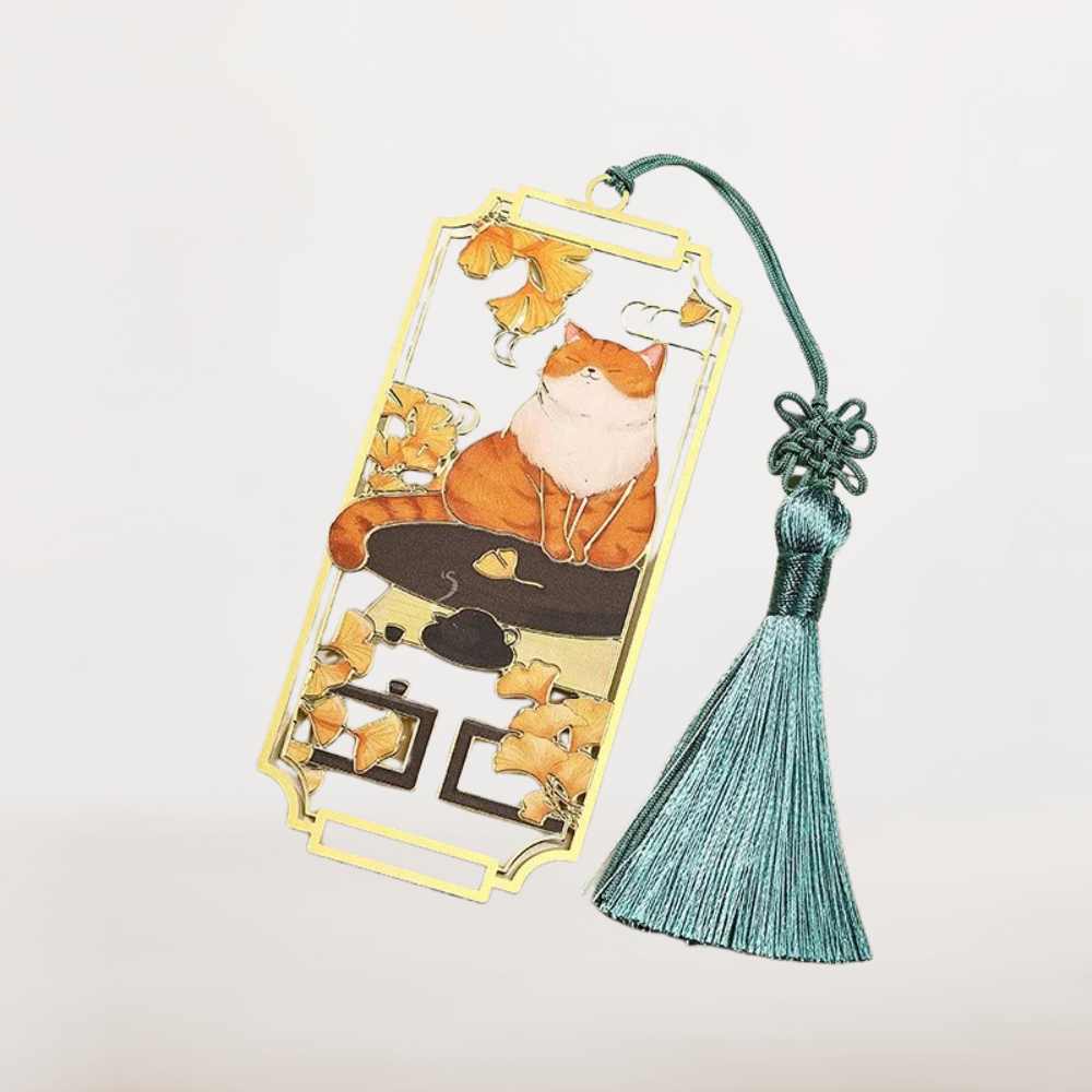 Un chat assis dans le calme absolu, entouré de feuilles dorées et de thé fumant. Ce marque page chat ajouré capture une scène de sérénité, où chaque détail invite à la contemplation. Le félin roux, noble et posé, semble méditer. Ce marque page kawaii transforme votre lecture en un rituel apaisant, entre esthétique japonaise, calme automnal et poésie féline.