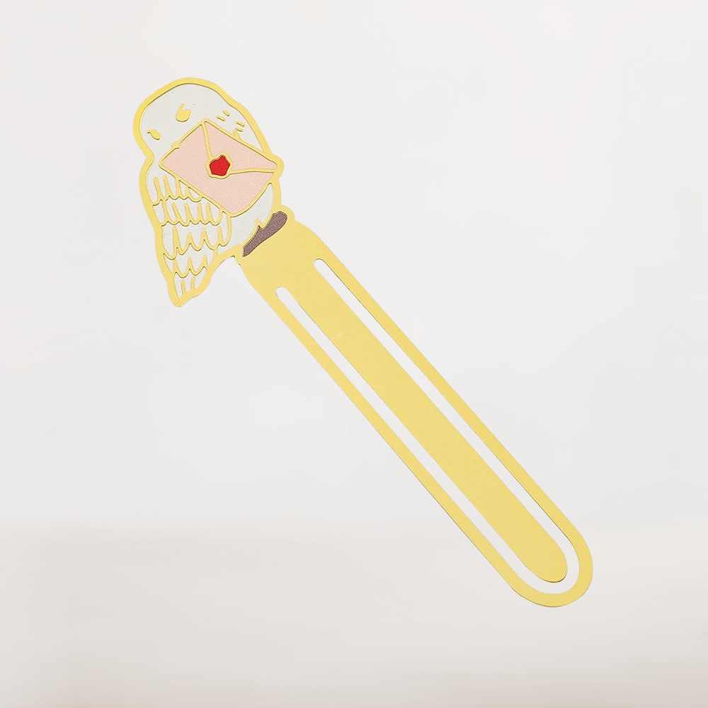 Un marque-page en métal doré représentant un oiseau tenant une lettre rouge, posé sur une page blanche