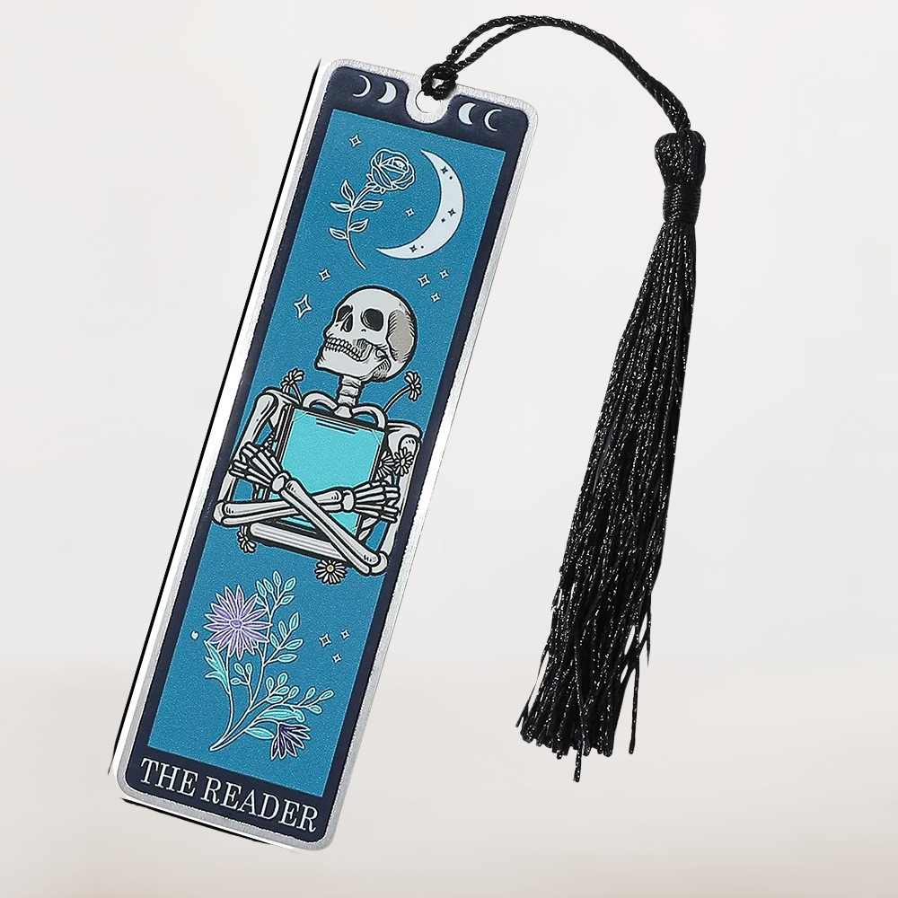 La mort lit aussi. Ce marque page halloween intitulé “The Reader” met en scène un squelette rêveur, livre en main, baigné par la lune et les étoiles. Entre mystique et poésie gothique, il incarne une vision romantique de la lecture éternelle. Idéal pour les amateurs d’esthétique occulte, de tarot et d’ambiances sombres mais élégantes.